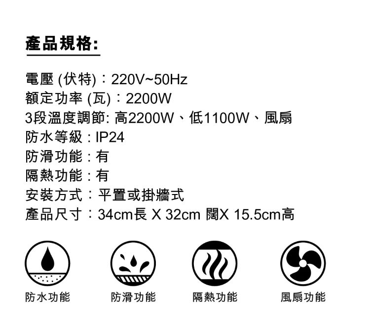 電壓 (伏特):220V~50Hz 額定功率 (瓦):2200W 3段溫度調節: 高2200W、低1100W、風扇 防水等級 : IP22 防滑功能 : 有 隔熱功能 : 有 安裝方式:平置或掛牆式