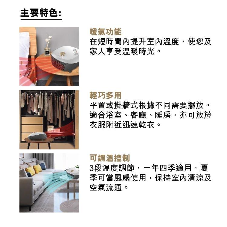 電壓 (伏特):220V~50Hz 額定功率 (瓦):2200W 3段溫度調節: 高2200W、低1100W、風扇 防水等級 : IP22 防滑功能 : 有 隔熱功能 : 有 安裝方式:平置或掛牆式